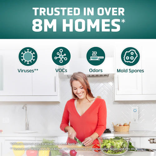 PureBreathe uses cutting-edge UV-C light and titanium dioxide (TiO₂) technology to kill bacteria, viruses, and mold spores while reducing volatile organic compounds (VOCs). Ideal for small spaces like bathrooms, kitchens, bedrooms, or pet areas — it quietly purifies up to 50 sq. ft.